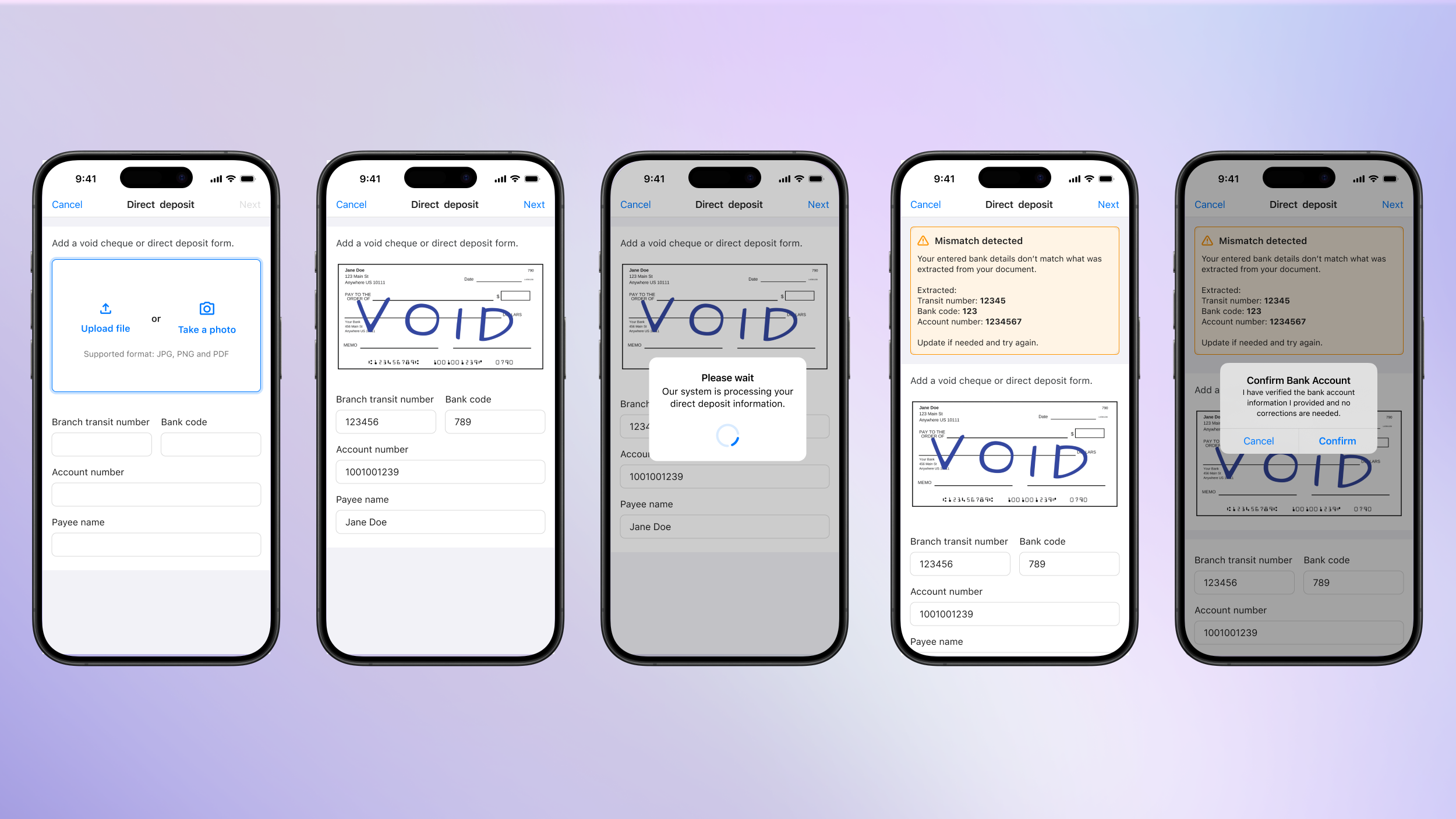 ✓ AI-assisted verification: After uploading their document, members see extracted banking details compared with what they entered.