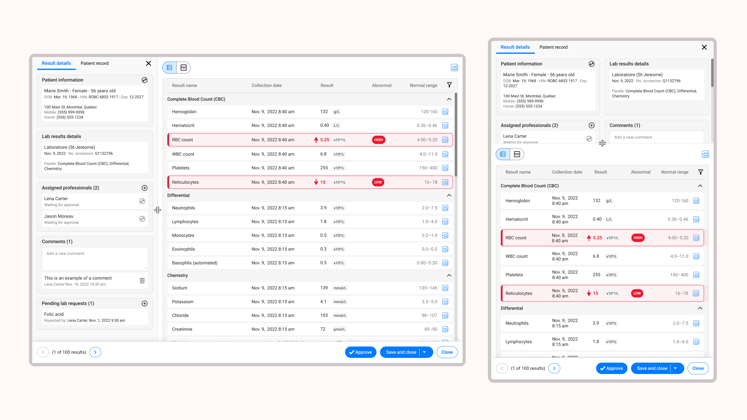 ✓ In-context patient information: A persistent way for clinicians to view relevant lab and patient details without leaving the results page.